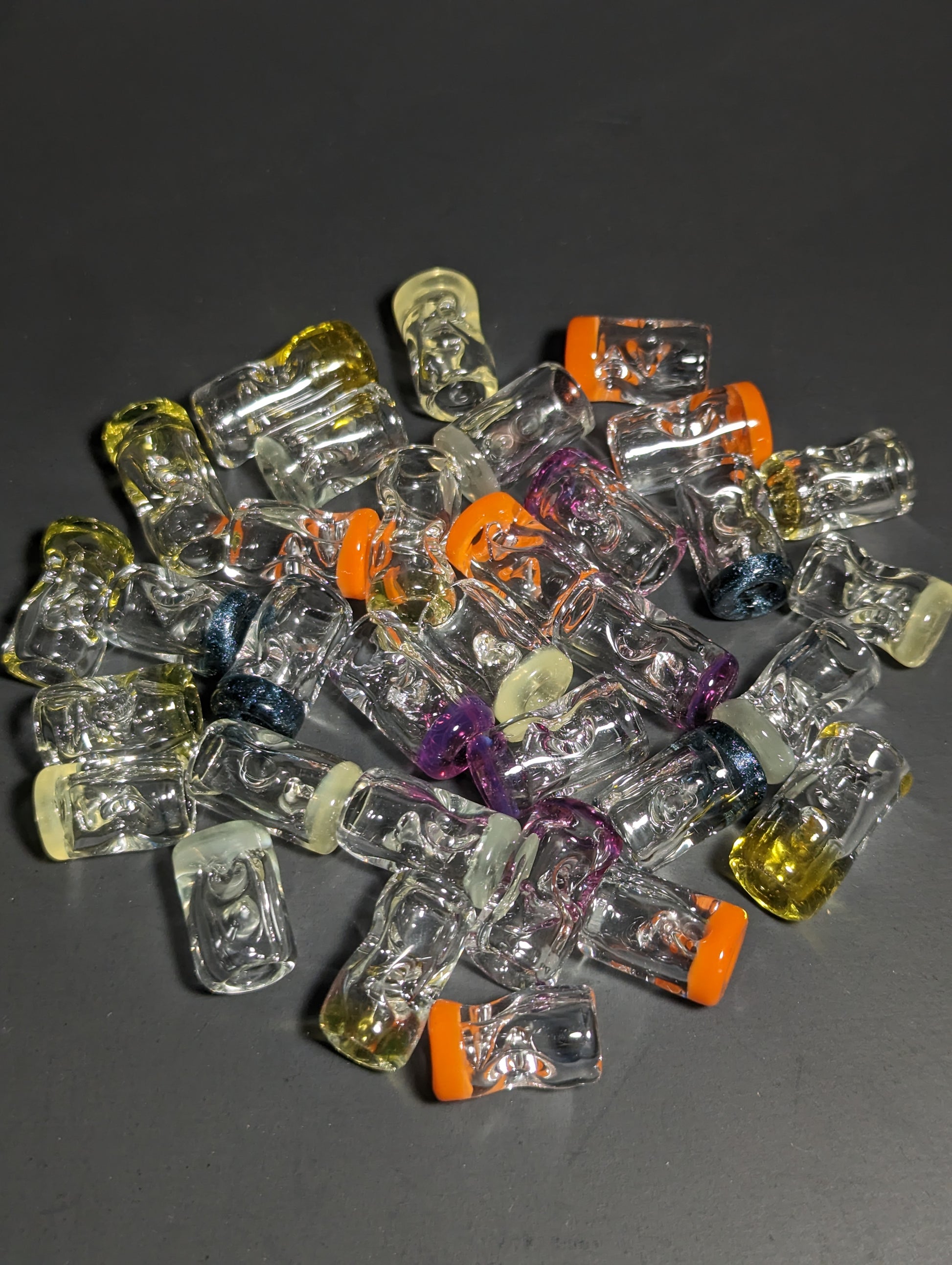 12mm glass tips with assorted colors of UV, CFL, Striking, Cadmium, etc. Leave a note with a color request on your order and we'll do our best to color match!