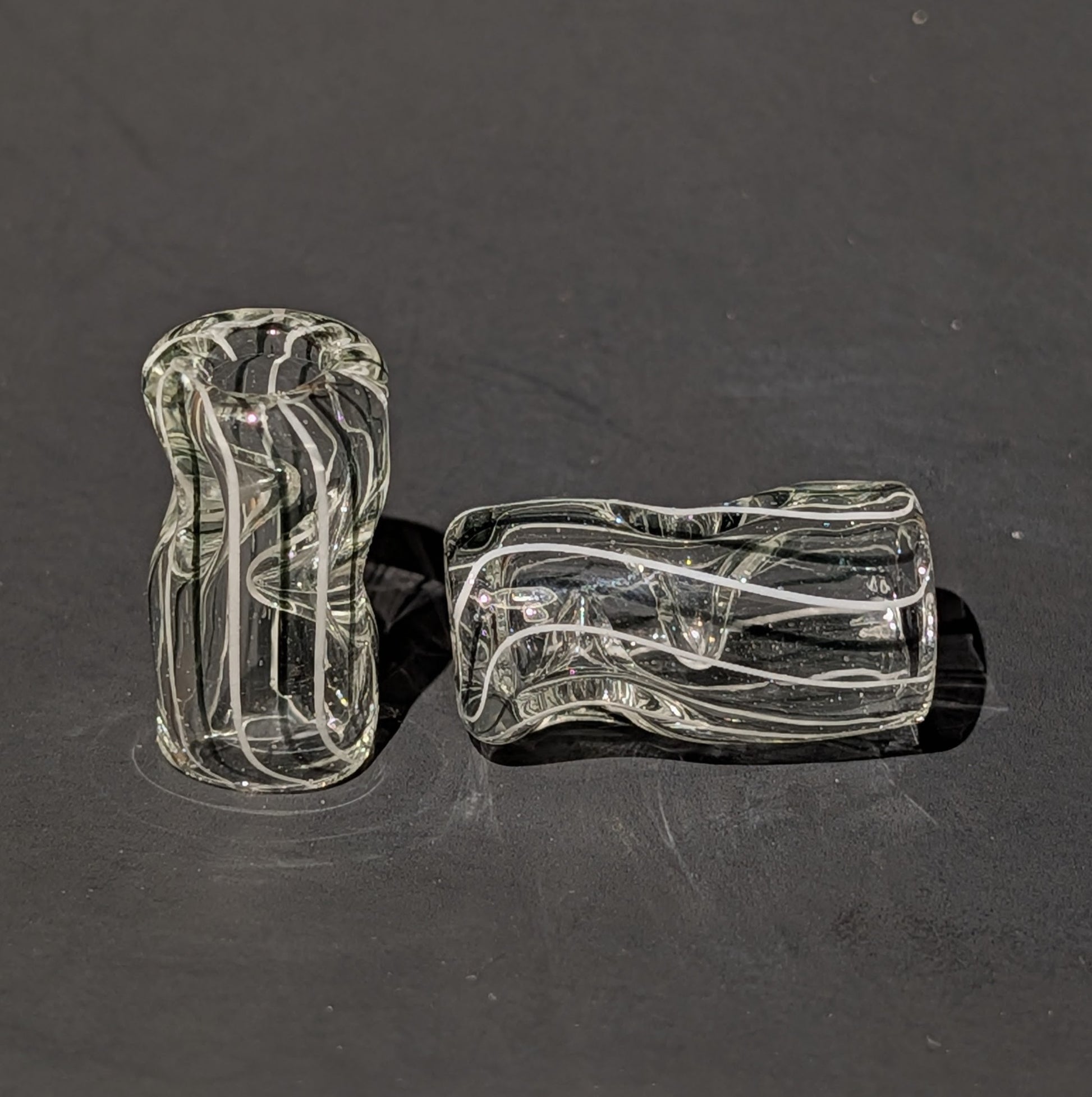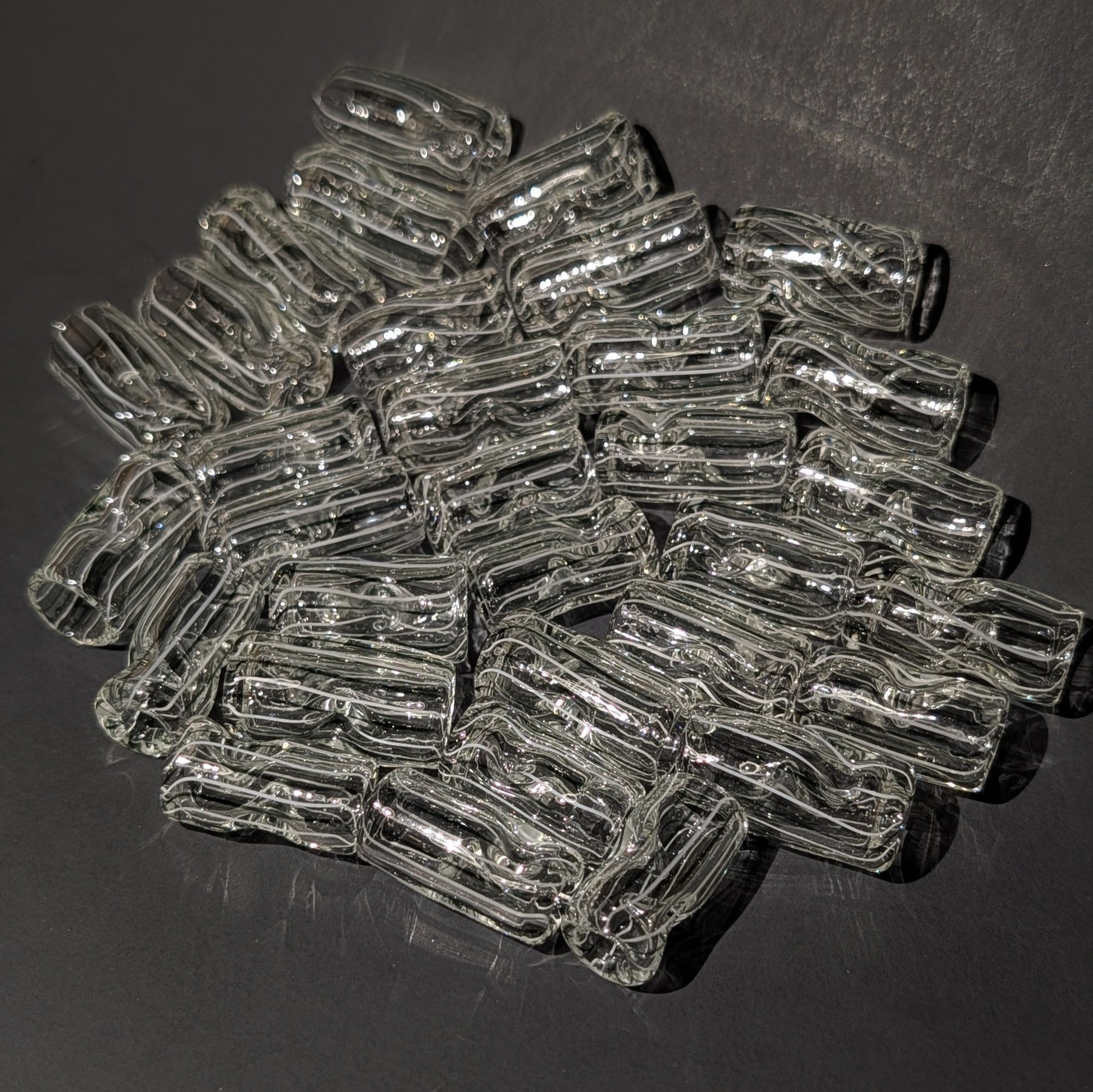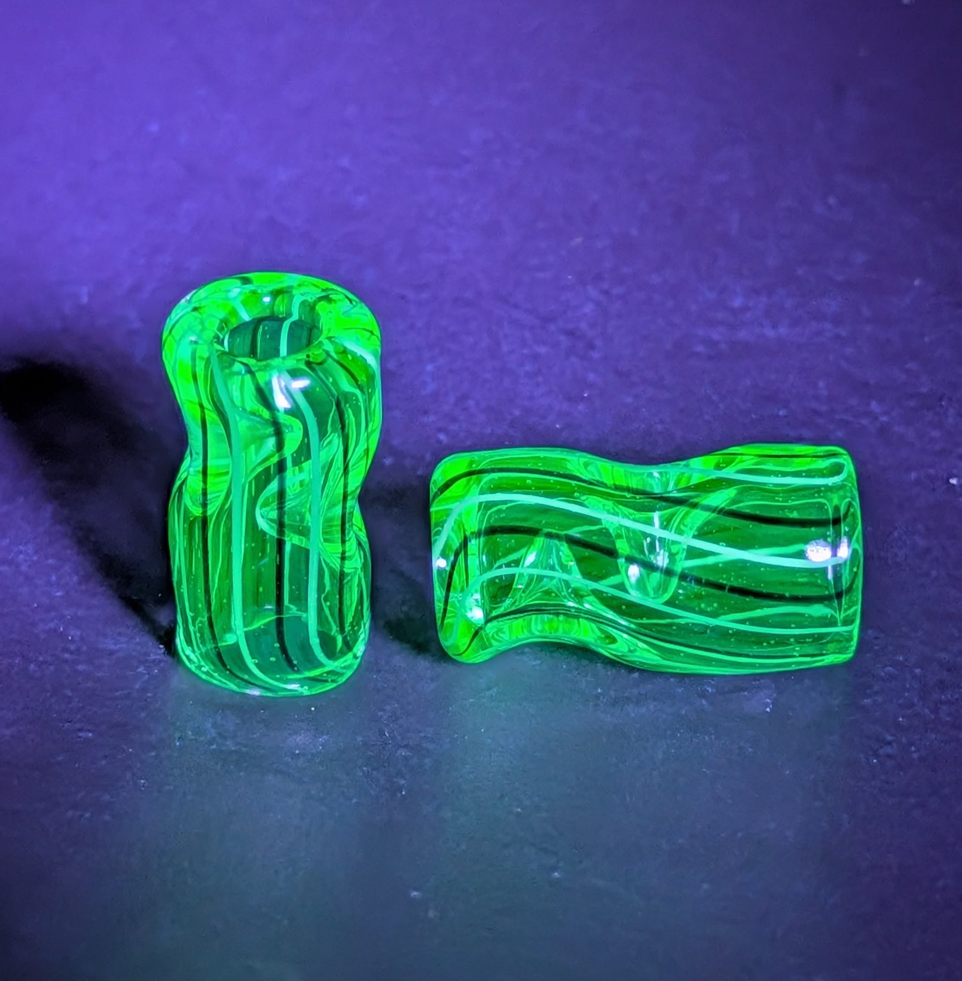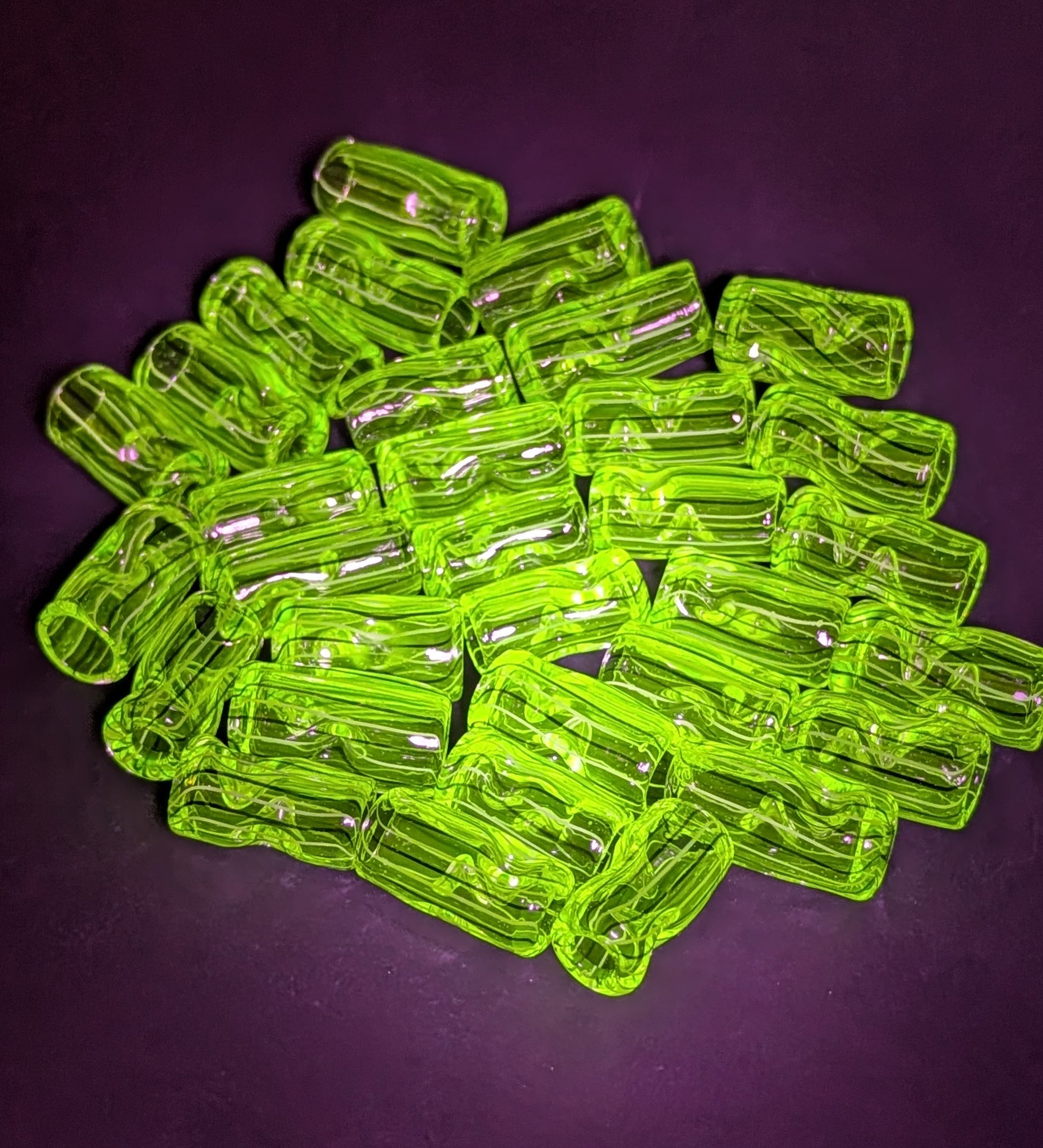 Varying sizes of Linework Tips made from a custom UV Green glass and Star White+Galaxy stringers pull for 2025s Halloween Drop, bright green reactivity under a UV light from uranium infused glass.
