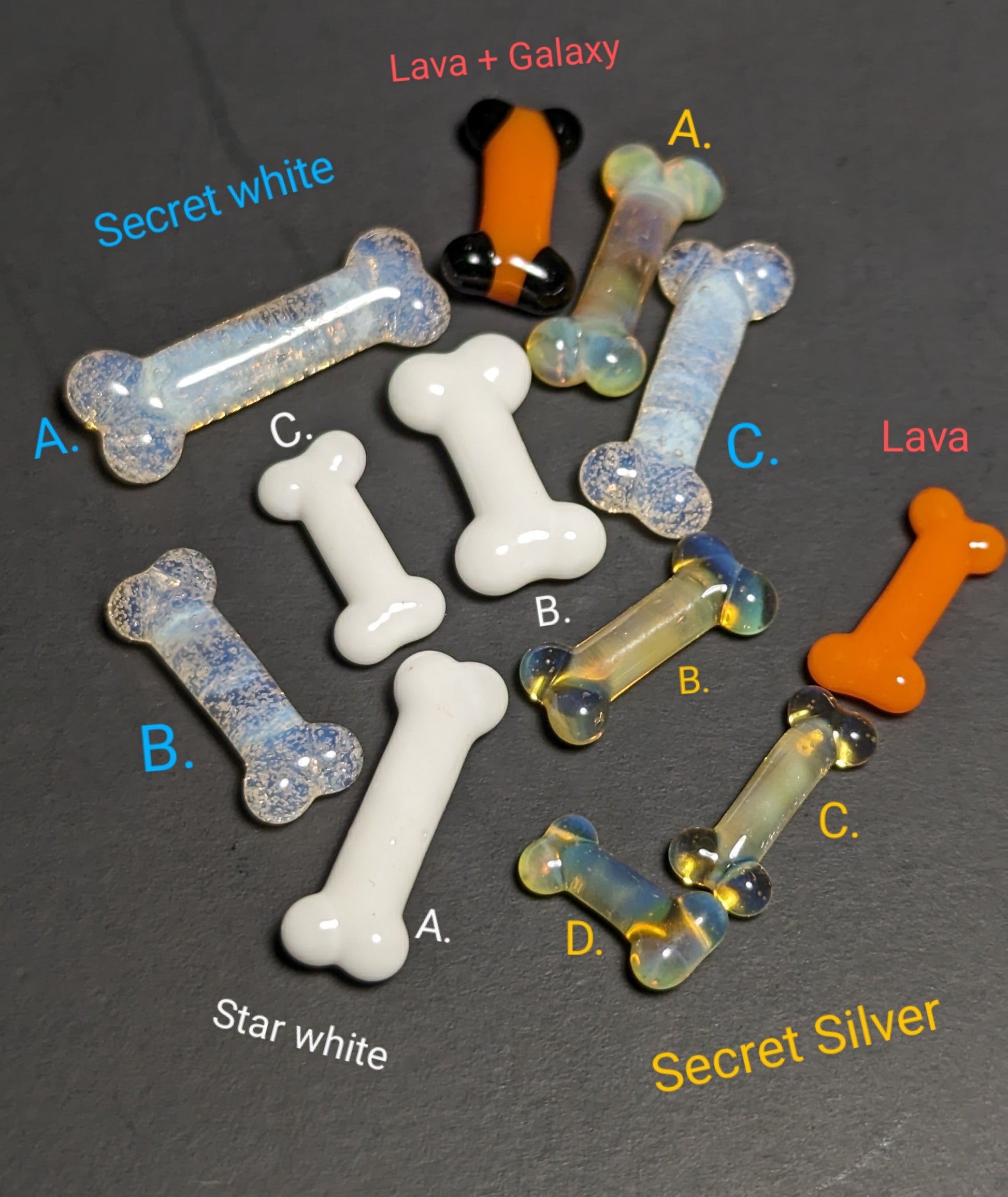 Lampworked bone shaped Terp Pillars, assorted colors labeled A,B,C..... etc.