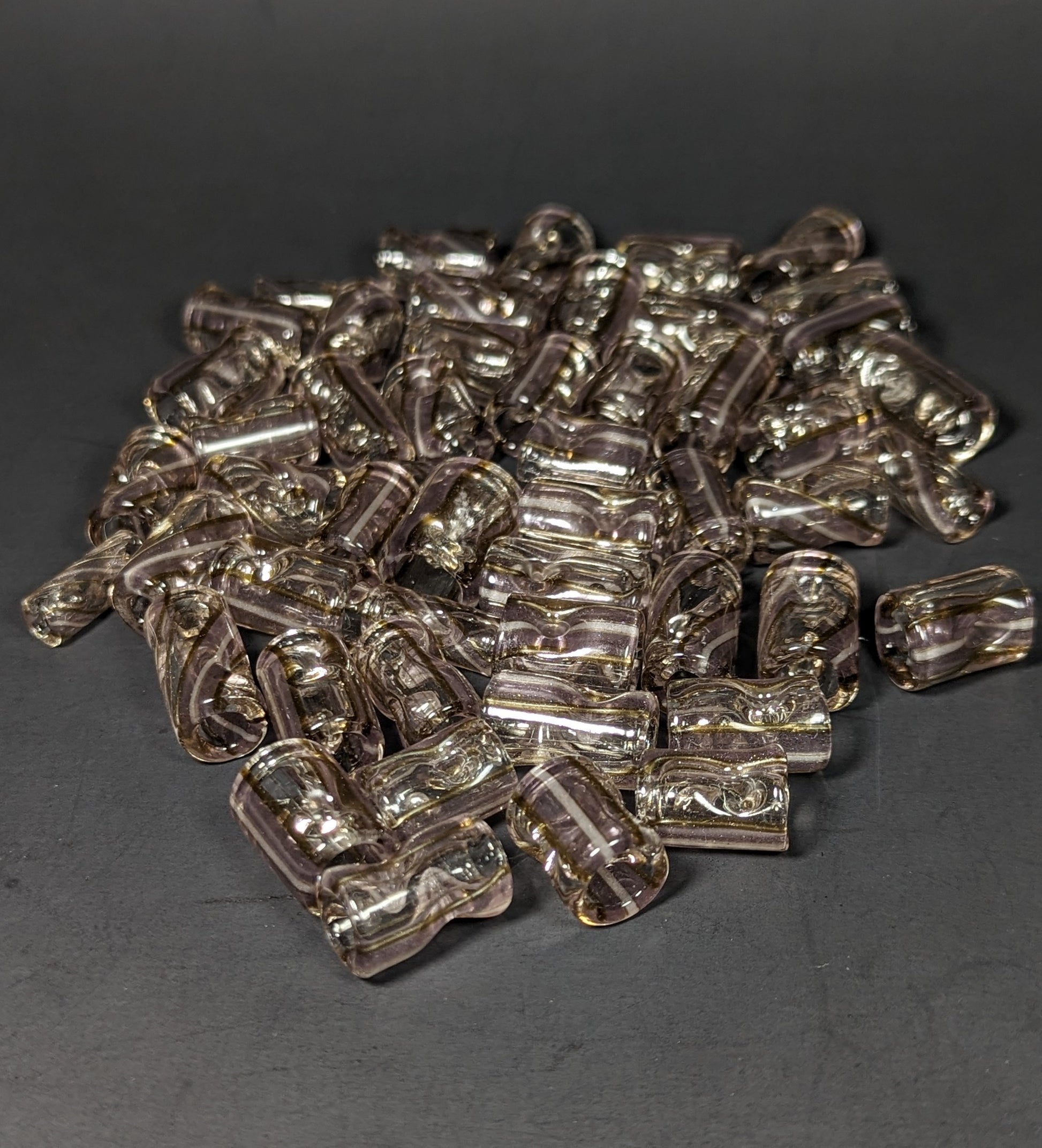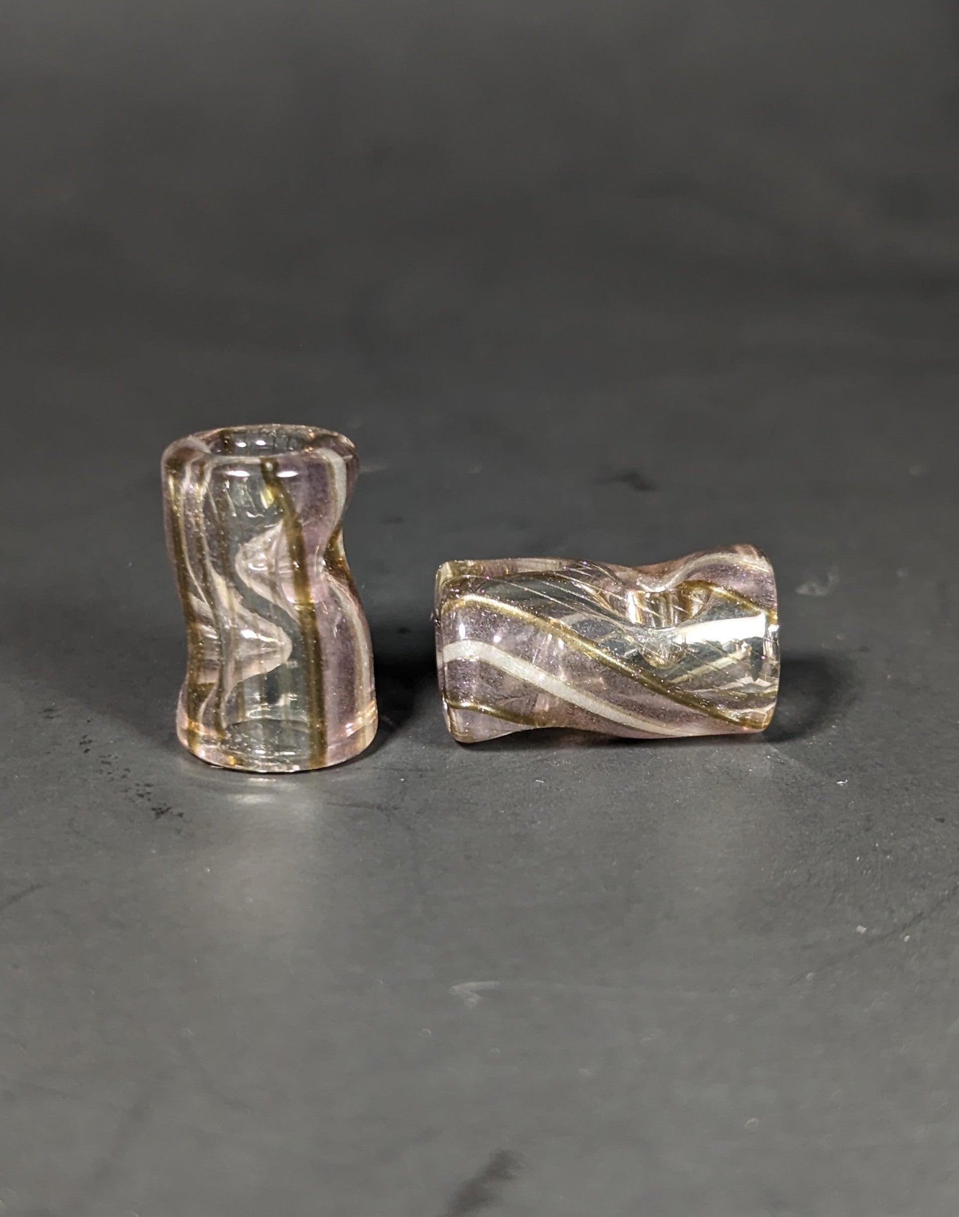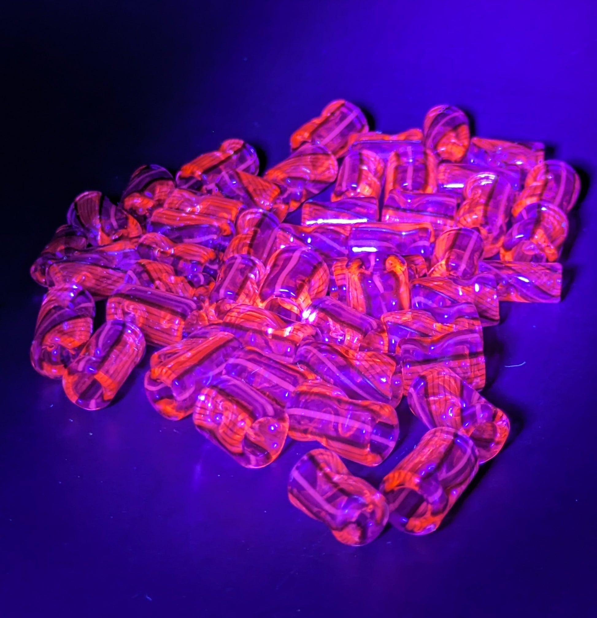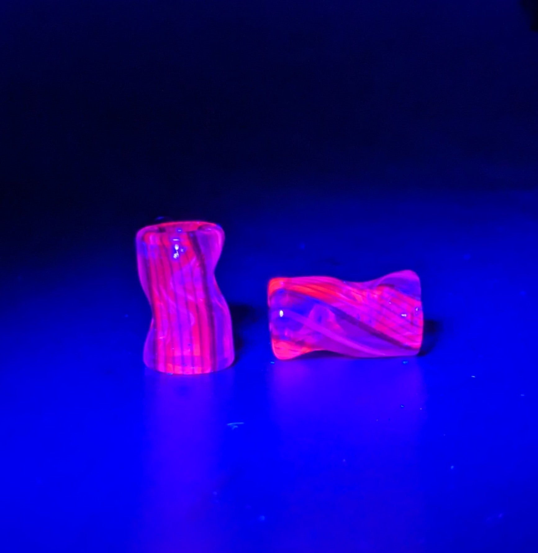 Varying sizes of Lined tubing tips made from Greasy Glass's recent tubing releases, glows pink UV under blacklight.