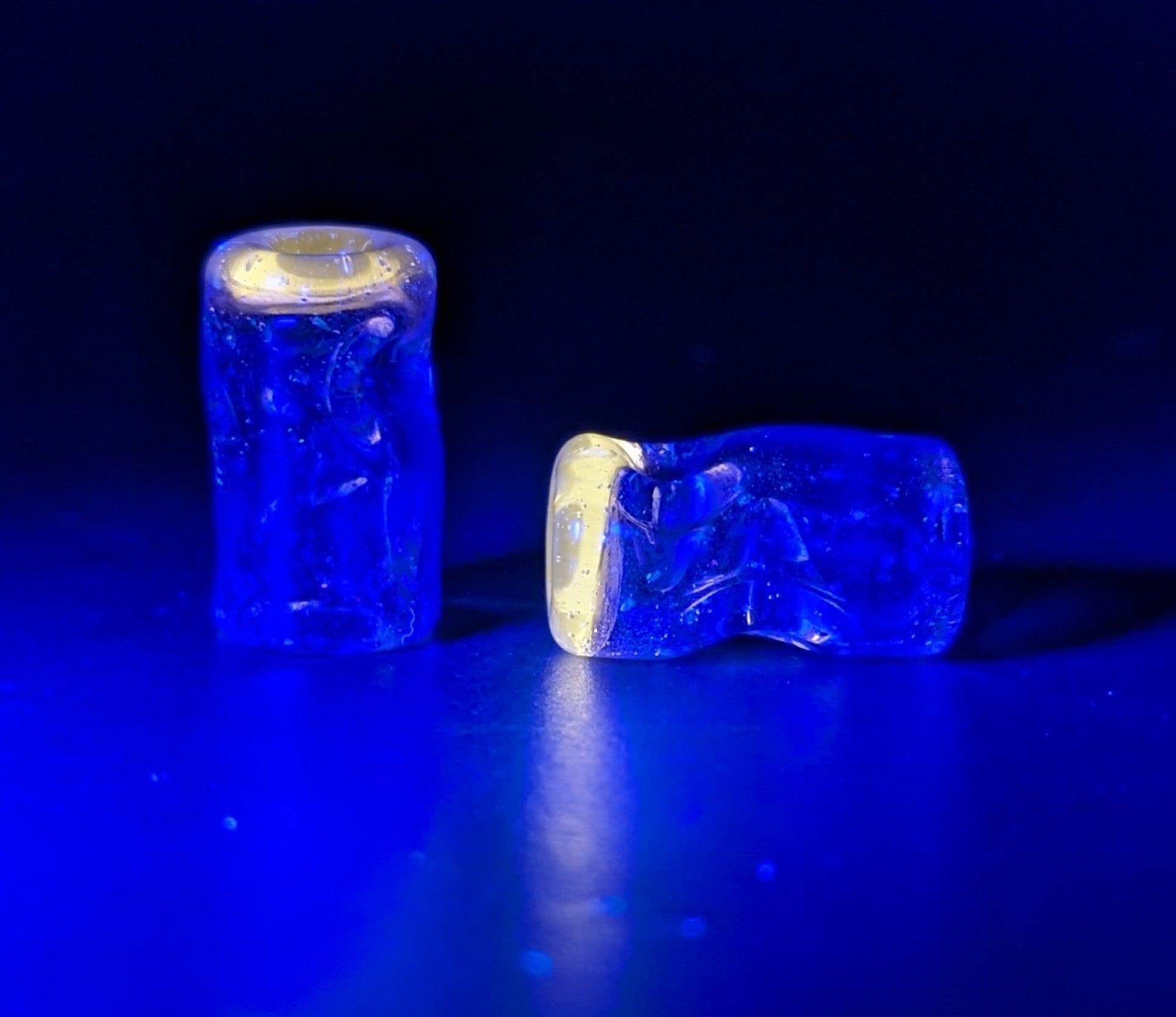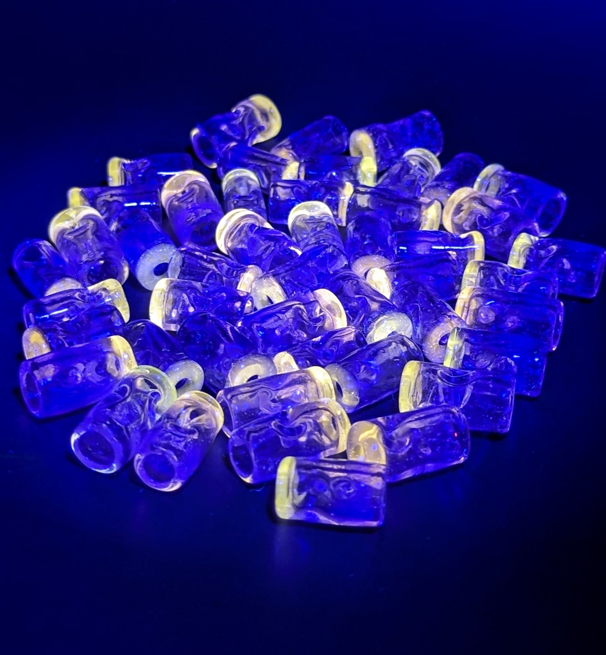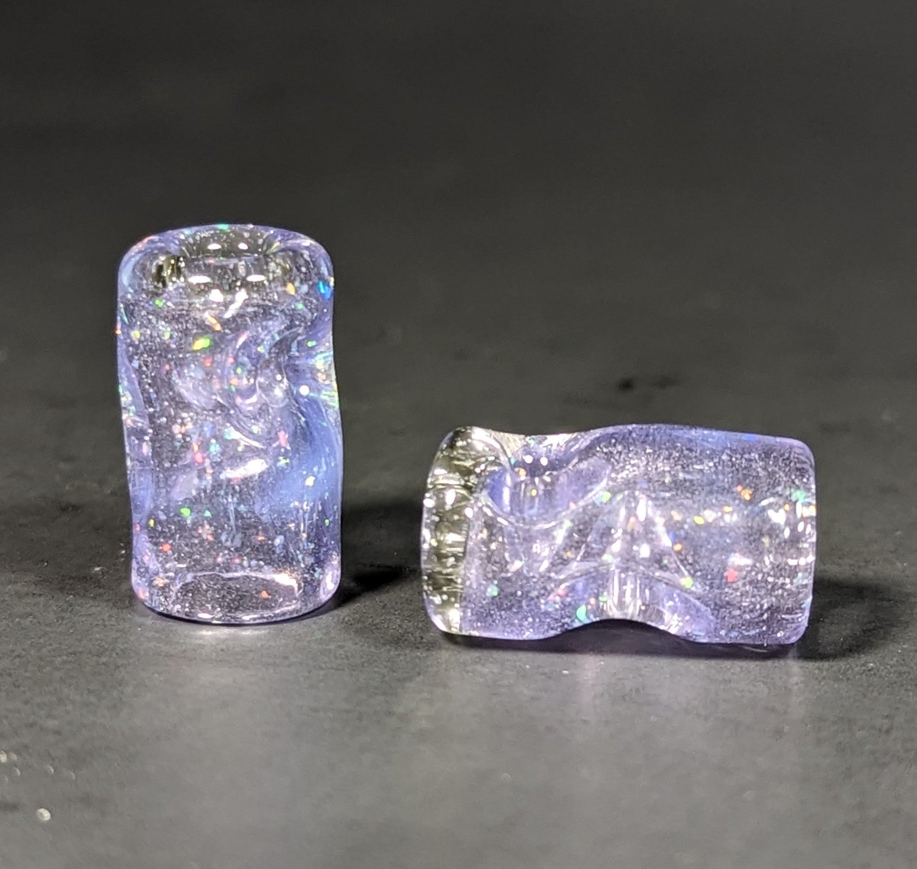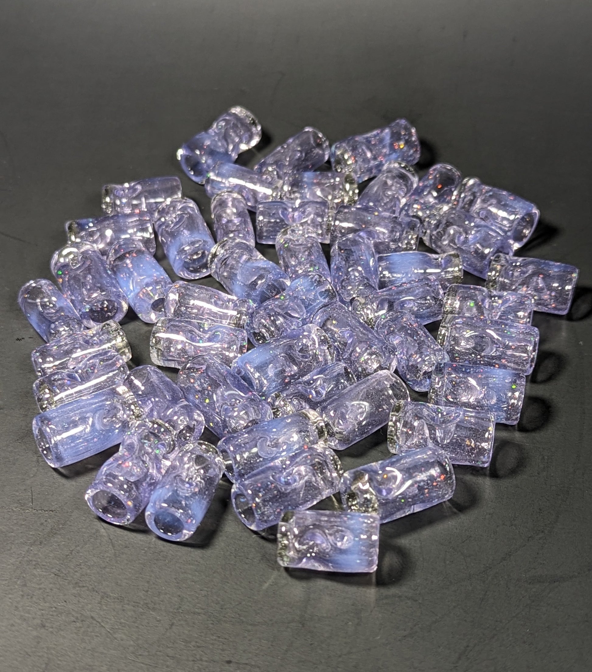 Varying sizes of Crushed Opal tips made from a custom Mint Crushed Opal pull sleeved on top of Wildberry Satin tubing, has a bright yellow Nova UV reactive lip under blacklight. I just love me some Lakers colors.