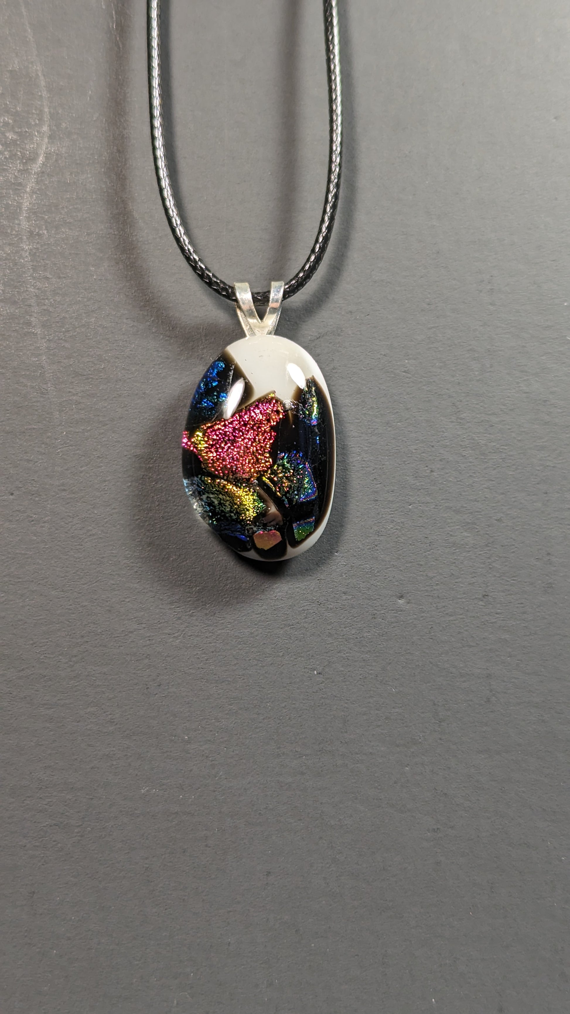 Glass pendant made from fused glass sheets coated in dichro, basic colored glass and clear glass which is sandwiched+fused inside a kiln. Loop is metal and adhered by glue. Pendant is roughly the size of a nickel.