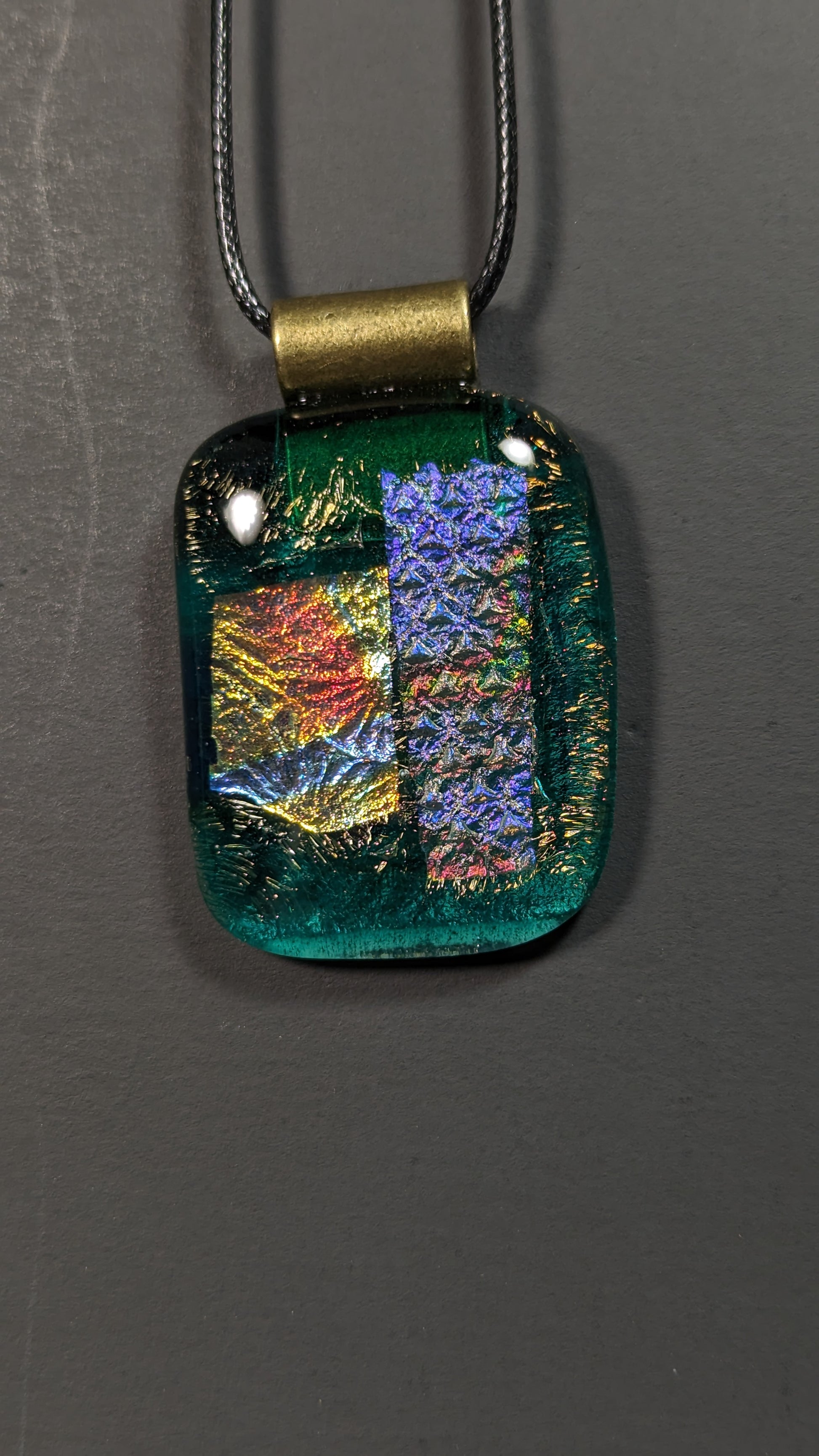 Glass pendant made from fused glass sheets coated in dichro, basic colored glass and clear glass which is sandwiched+fused inside a kiln. Loop is metal and adhered by glue. Pendant is roughly the size of a half dollar coin.