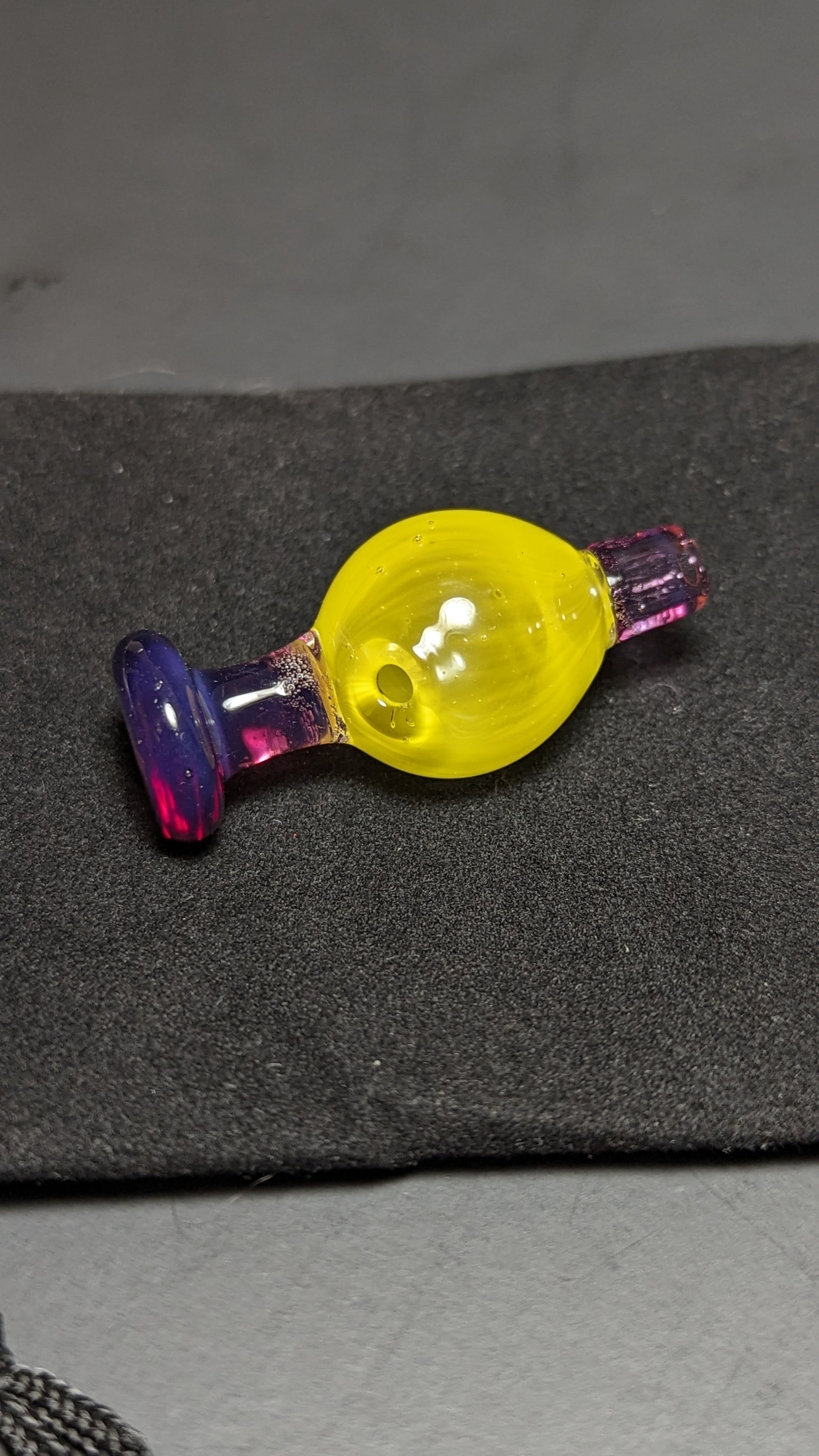 Glassblown borosilicate carb cap made from Gold purple Phoenix and yellow crayon, roughly 18-21mm in diameter.