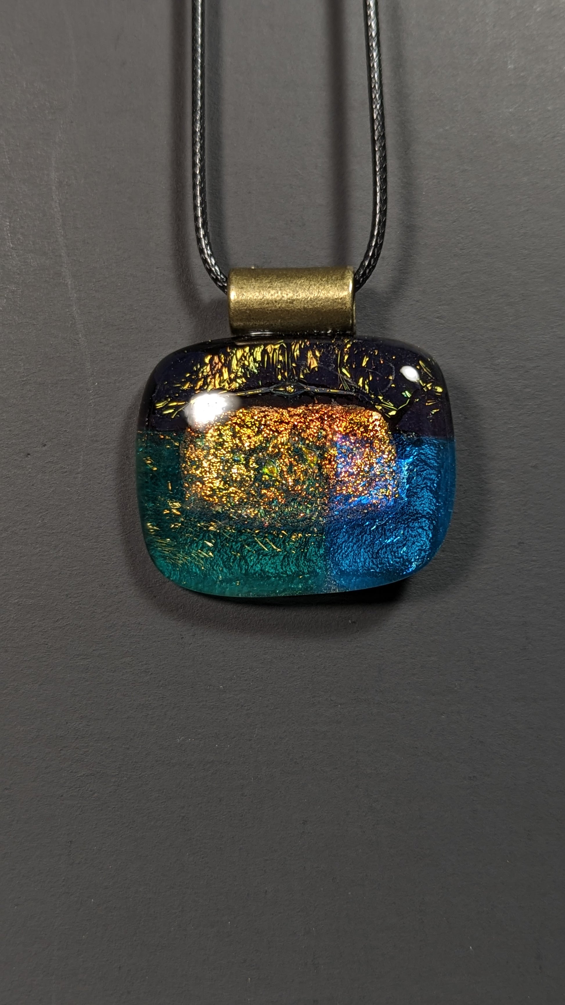 Glass pendant made from fused glass sheets coated in dichro, basic colored glass and clear glass which is sandwiched+fused inside a kiln. Loop is metal and adhered by glue. Pendant is roughly the size of a half dollar coin.