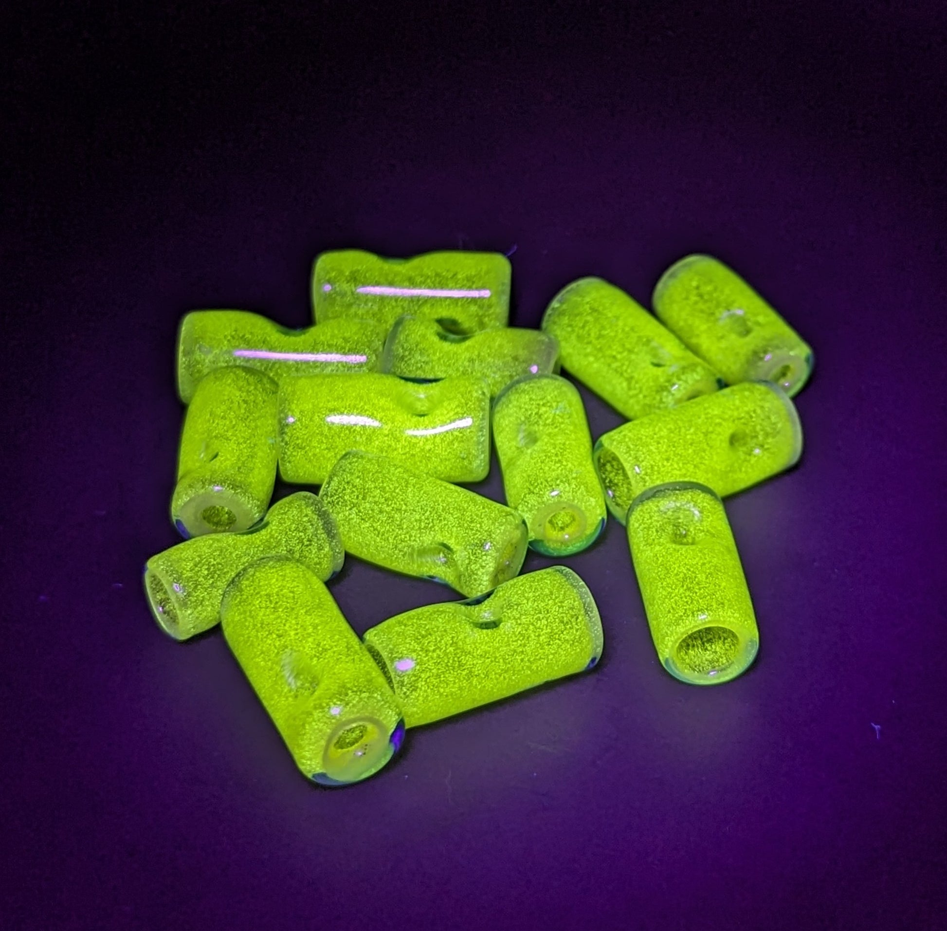 Glow in the dark tips made from Boro Glows color - Guacamole; reactive Green under both blacklight and after charging in normal light.