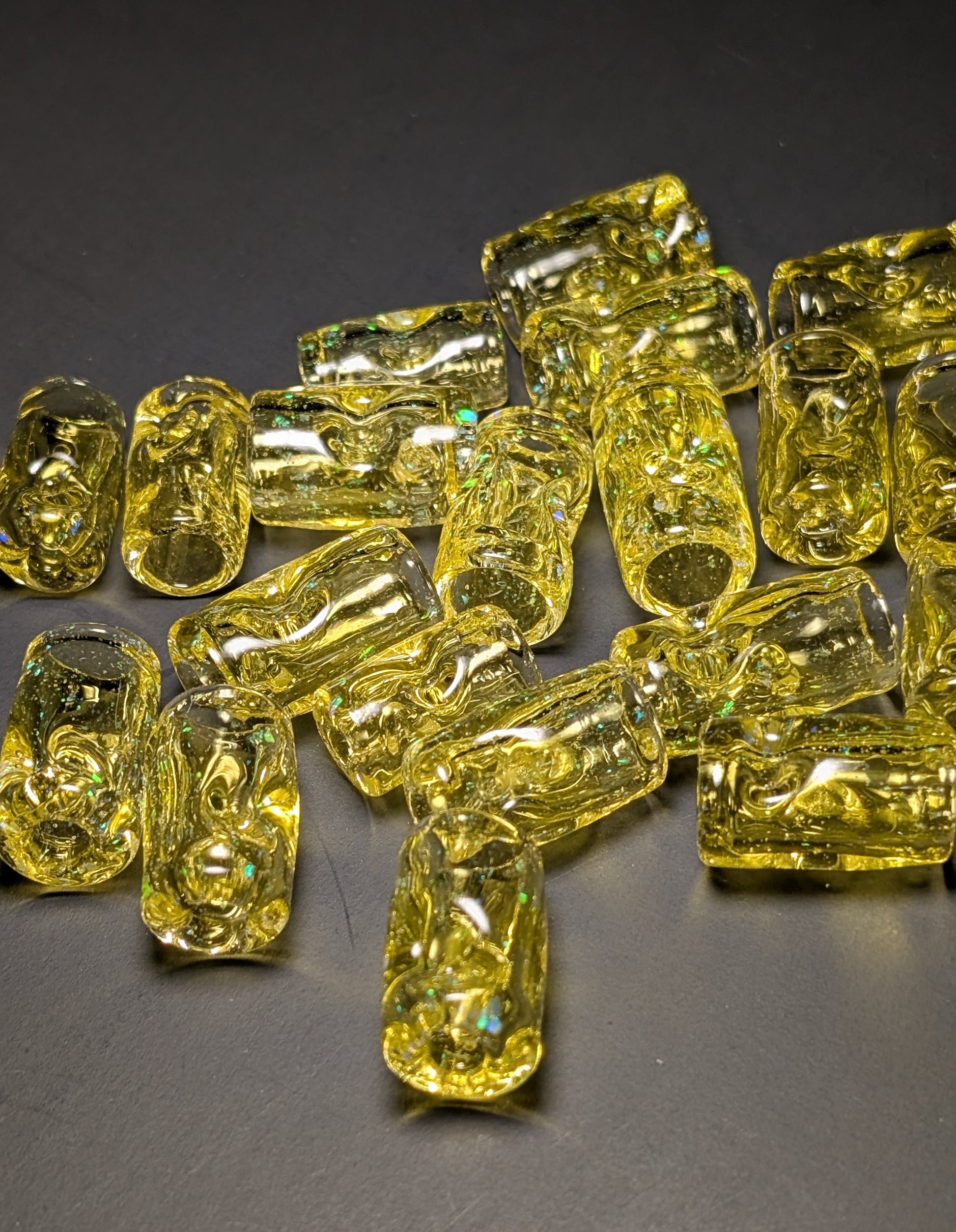 Varying sizes of Crushed Opal tips made from a custom Mint Crushed Opal pull sleeved on top of Terps tubing for 2024s Halloween Drop, CFL reactive shift from yellow to orange depending on the lighting.