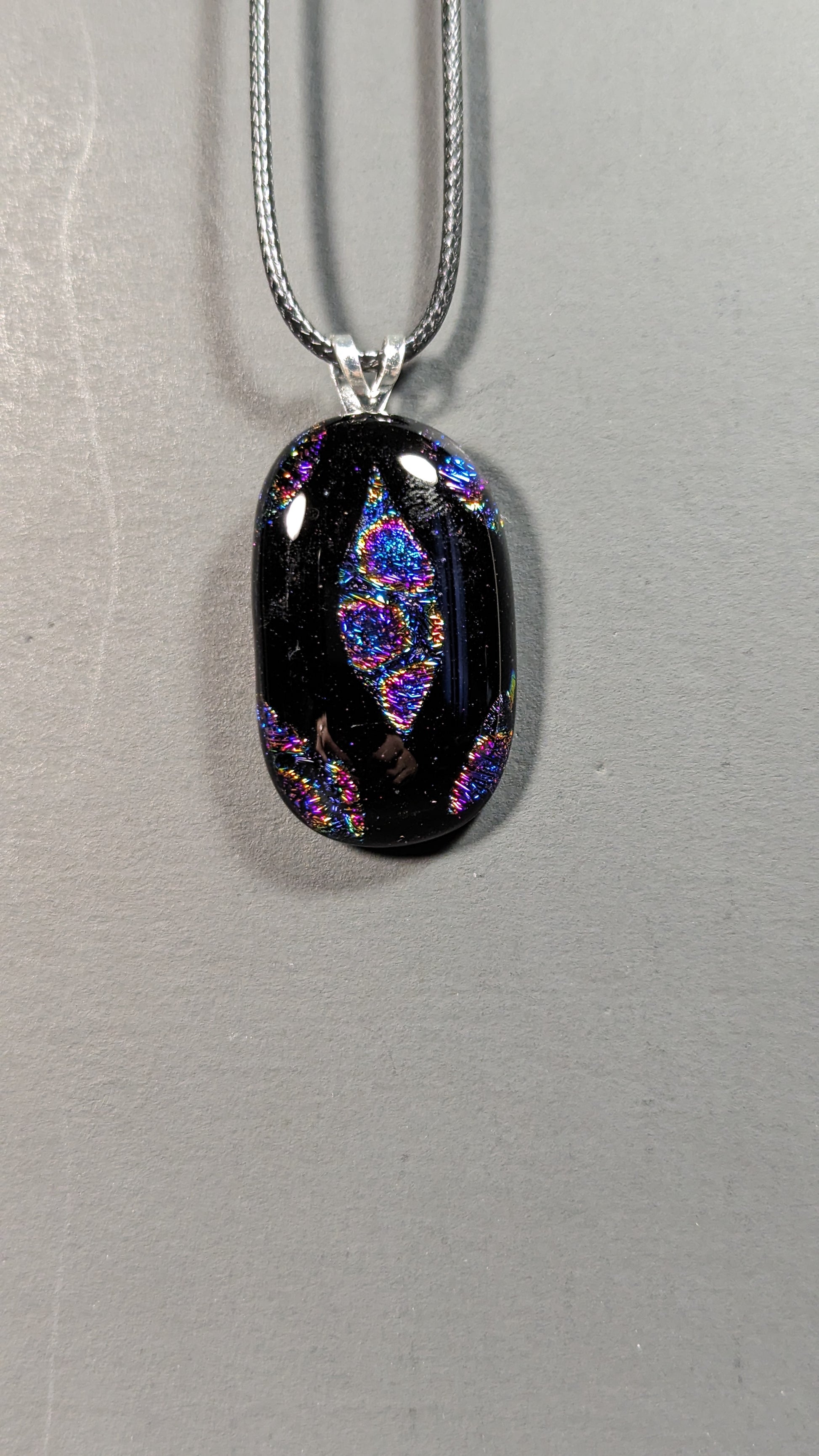 Glass pendant made from fused glass sheets coated in dichro, basic colored glass and clear glass which is sandwiched+fused inside a kiln. Loop is metal and adhered by glue. Pendant is roughly the size of a nickel.