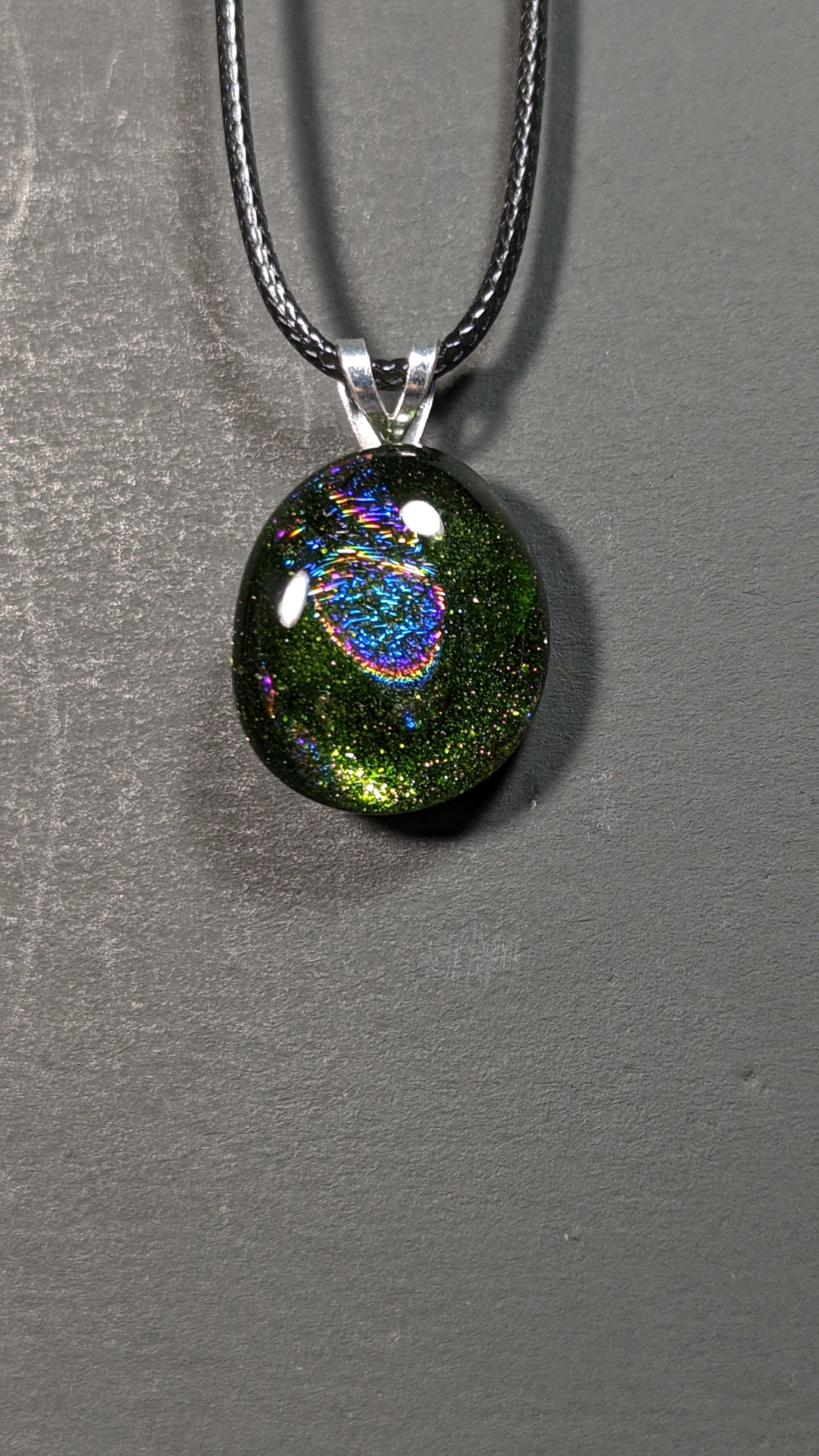Glass pendant made from fused glass sheets coated in dichro, basic colored glass and clear glass which is sandwiched+fused inside a kiln. Loop is metal and adhered by glue. Pendant is roughly the size of a nickel.