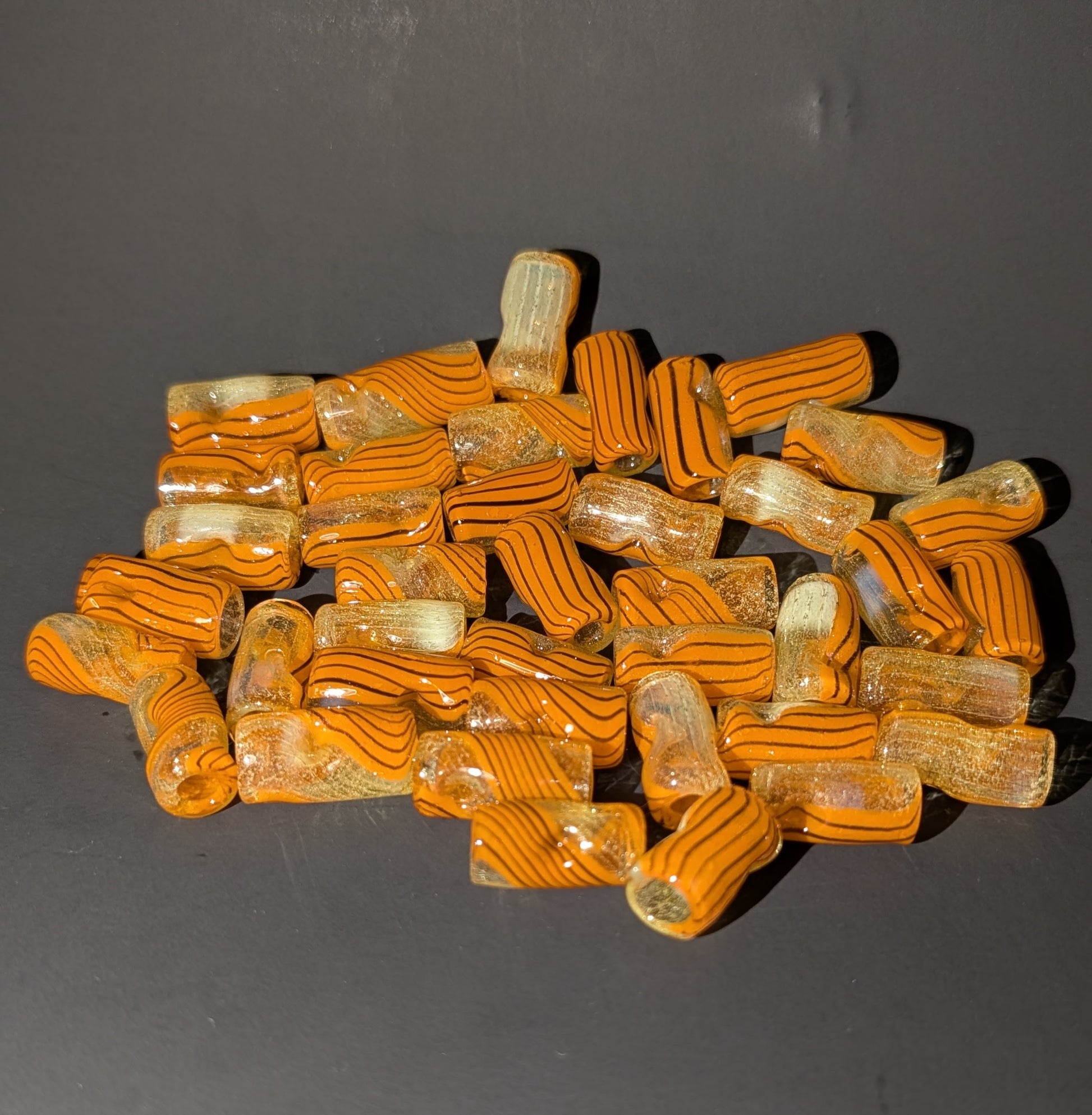 Varying sizes of Linework Tips made from a custom Sunset Slyme and Lava+Galaxy Linework pull for 2025s Halloween Drop, CFL reactive shift from green to smoky purple on one side depending on the lighting and small reactivity from the Lava orange under UV lighting.