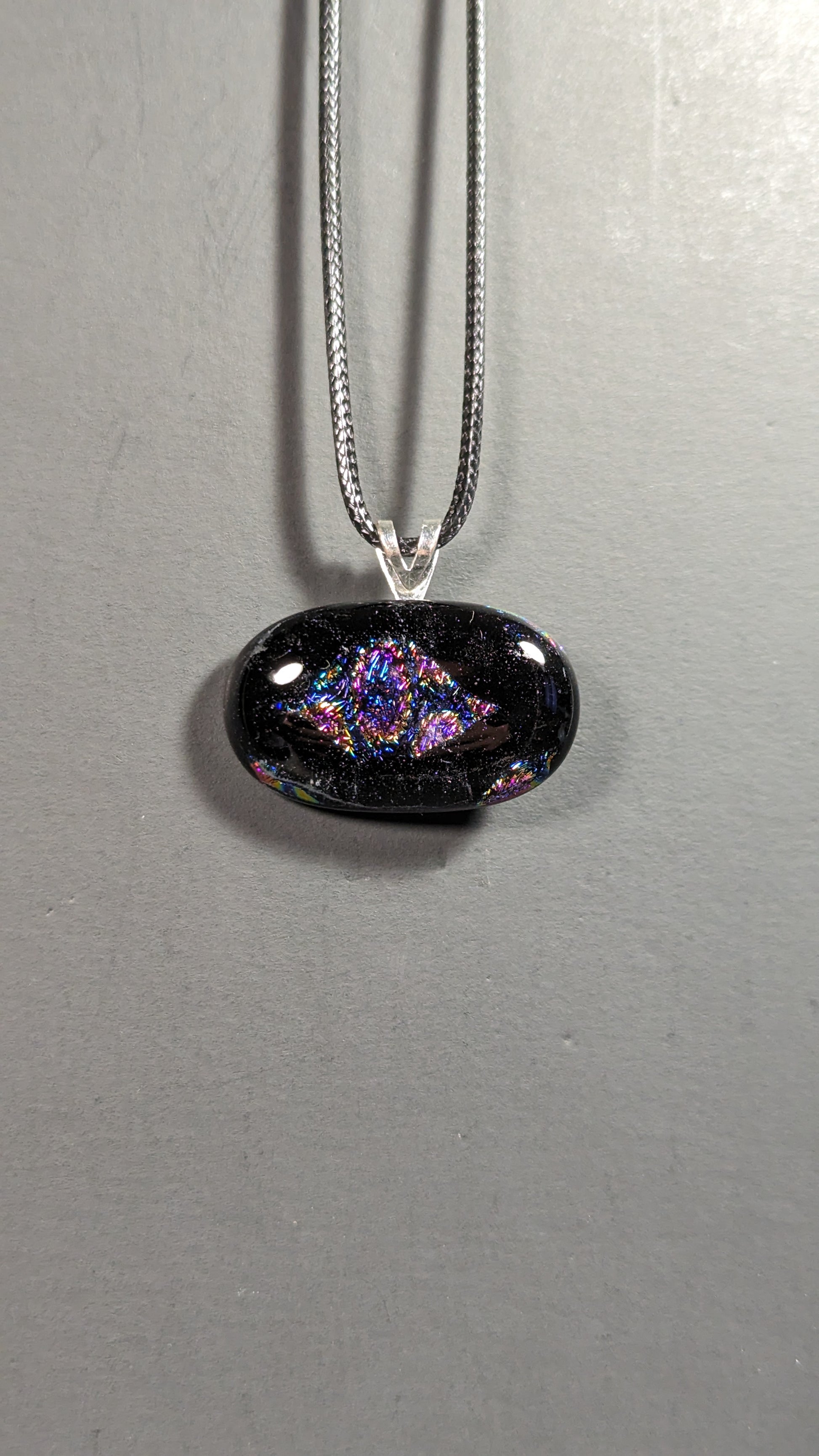 Glass pendant made from fused glass sheets coated in dichro, basic colored glass and clear glass which is sandwiched+fused inside a kiln. Loop is metal and adhered by glue. Pendant is roughly the size of a nickel.