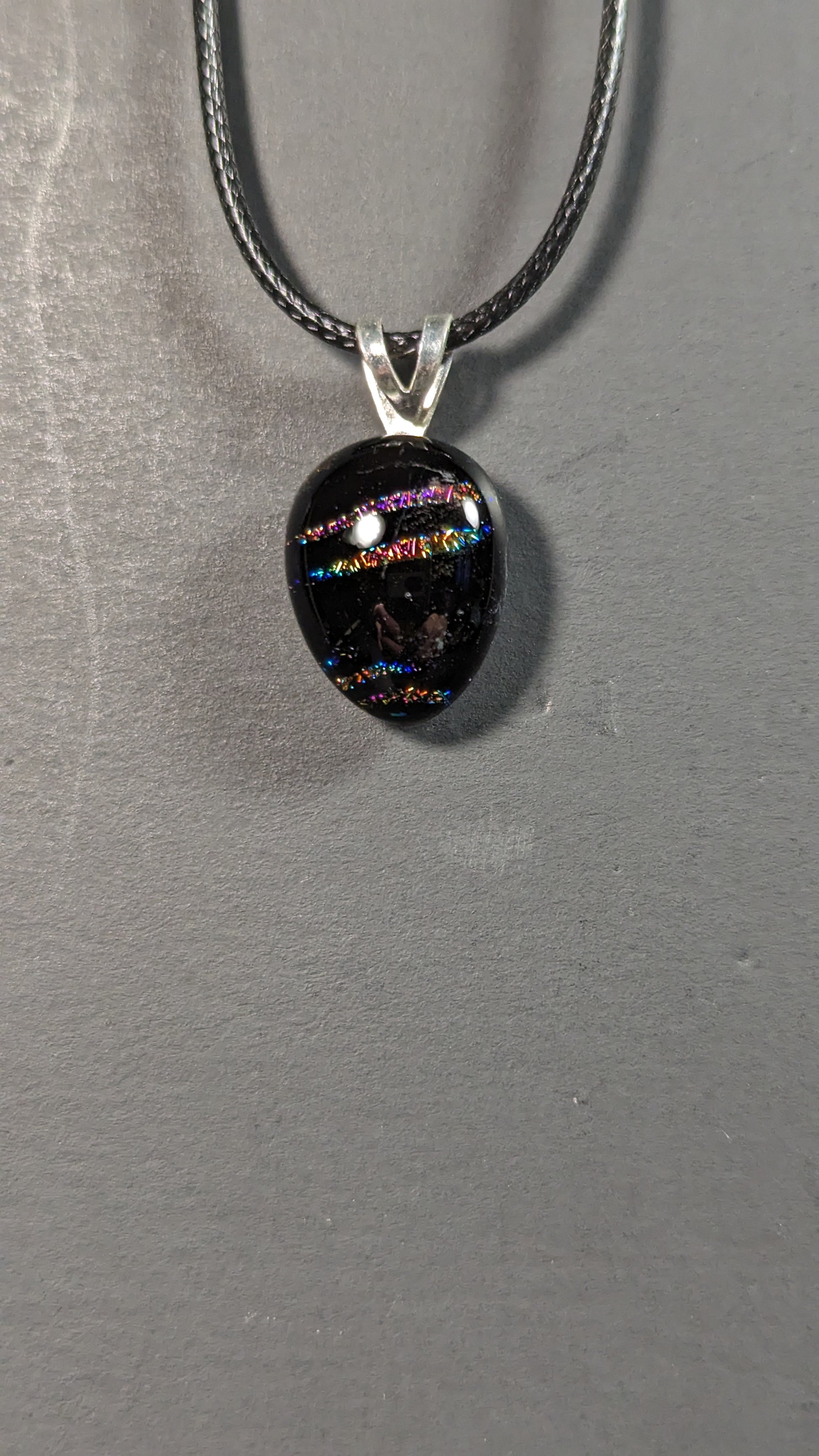 Glass pendant made from fused glass sheets coated in dichro, basic colored glass and clear glass which is sandwiched+fused inside a kiln. Loop is metal and adhered by glue. Pendant is roughly the size of a nickel.
