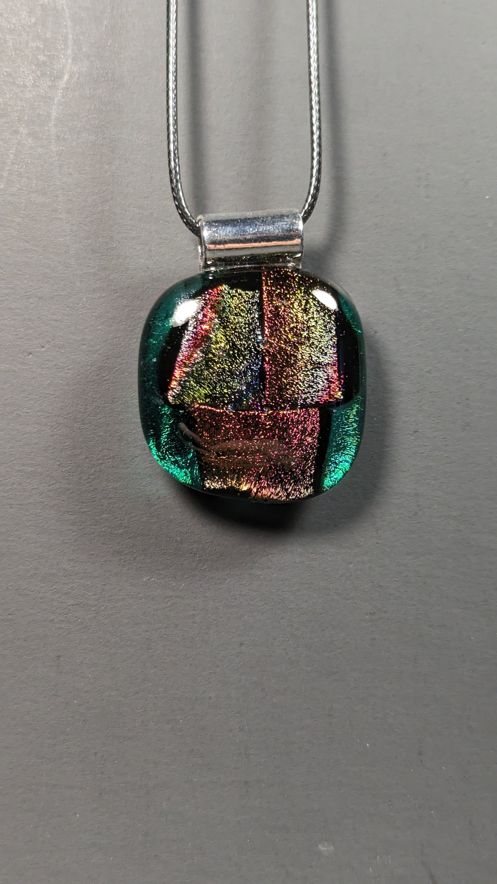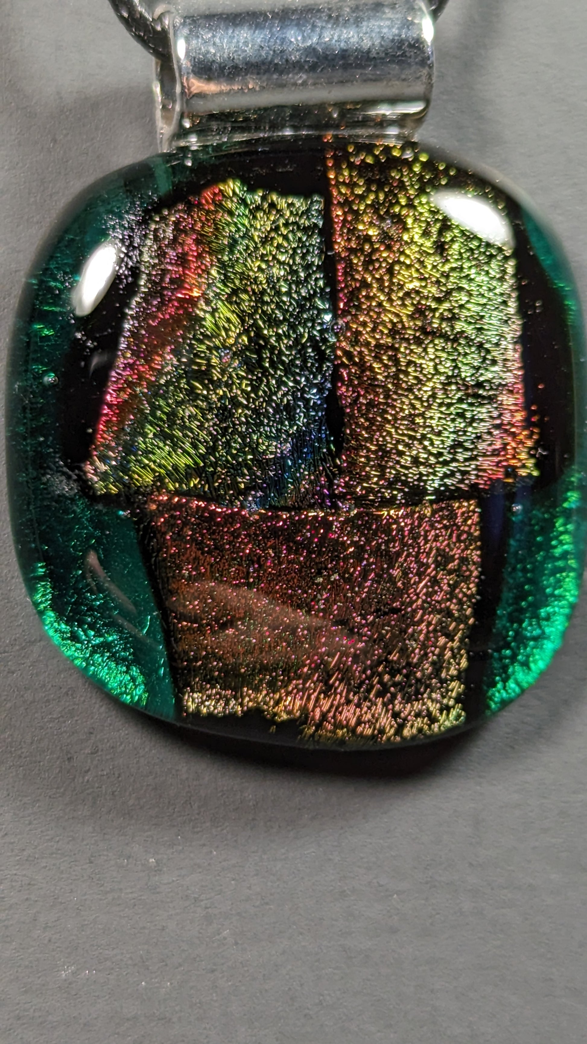 Glass pendant made from fused glass sheets coated in dichro, basic colored glass and clear glass which is sandwiched+fused inside a kiln. Loop is metal and adhered by glue. Pendant is roughly the size of a half dollar coin.